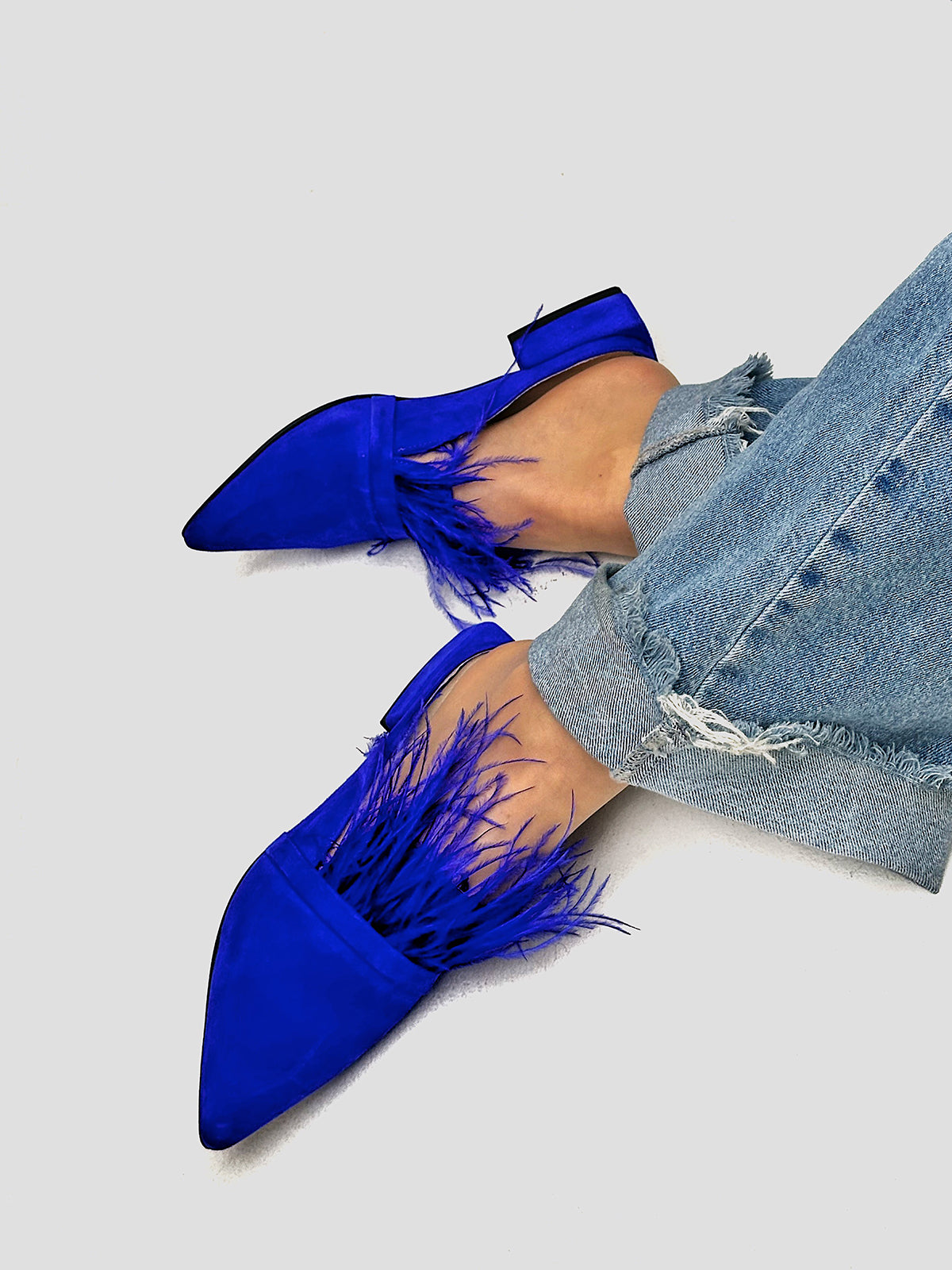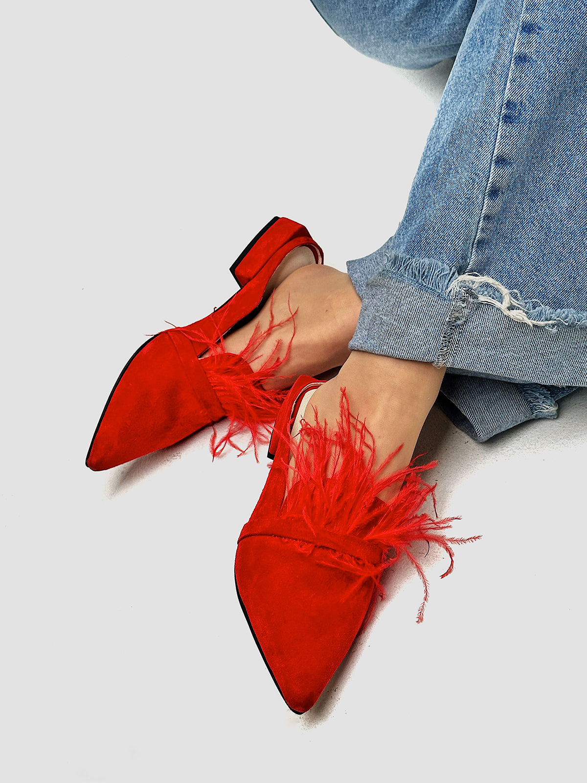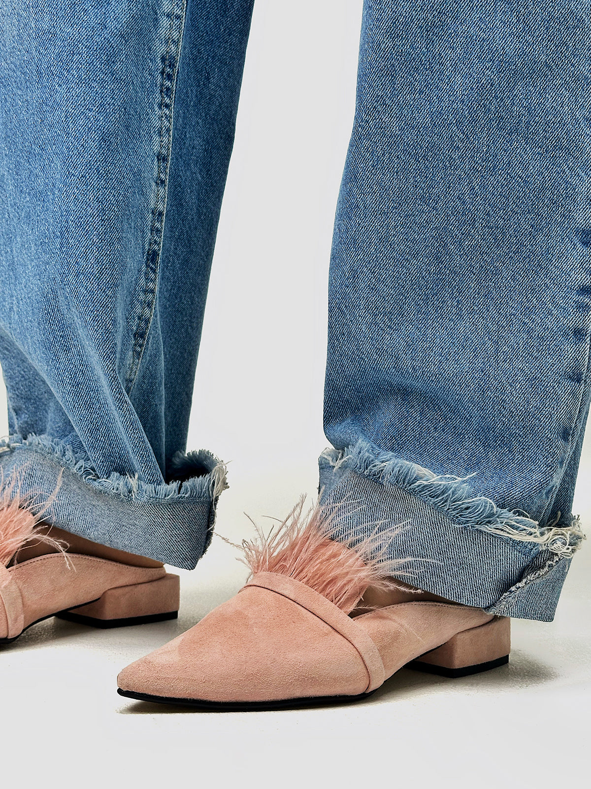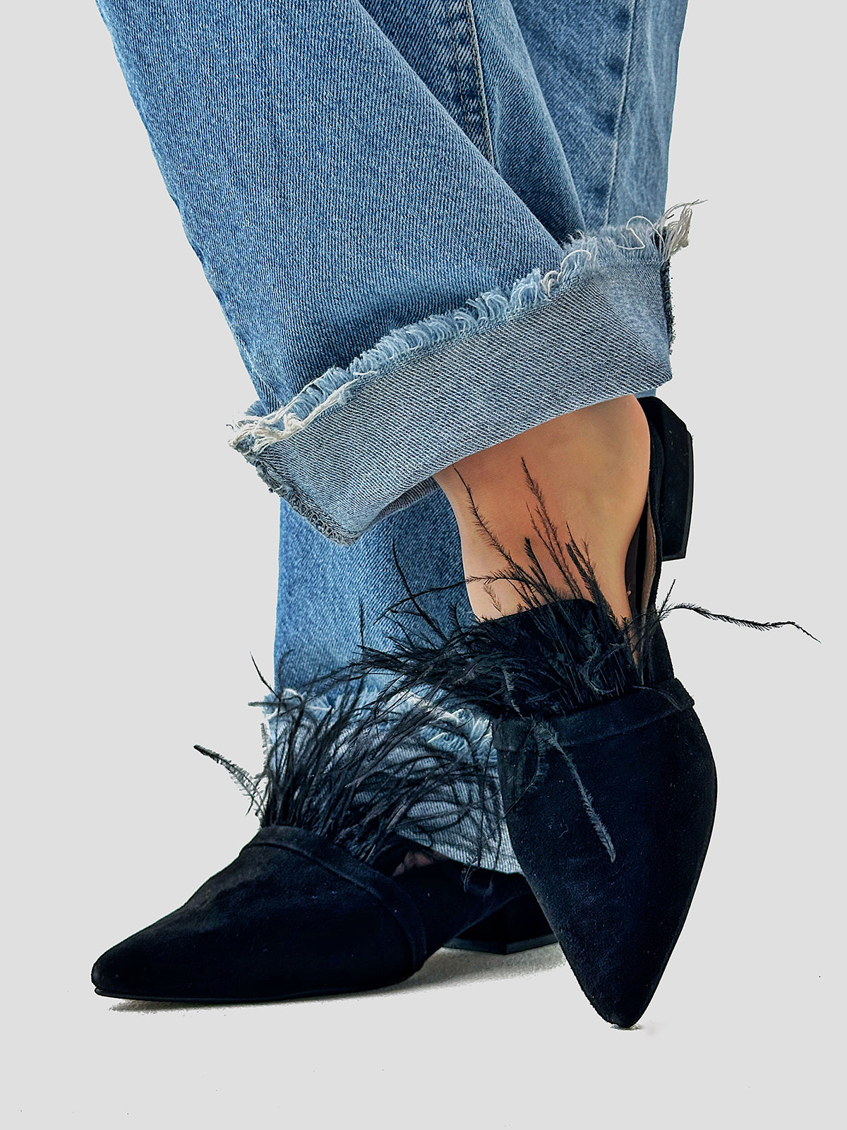 Damskie letnie muły wykonane w 100% z zamszu z ozdobnymi strusimi piórami.