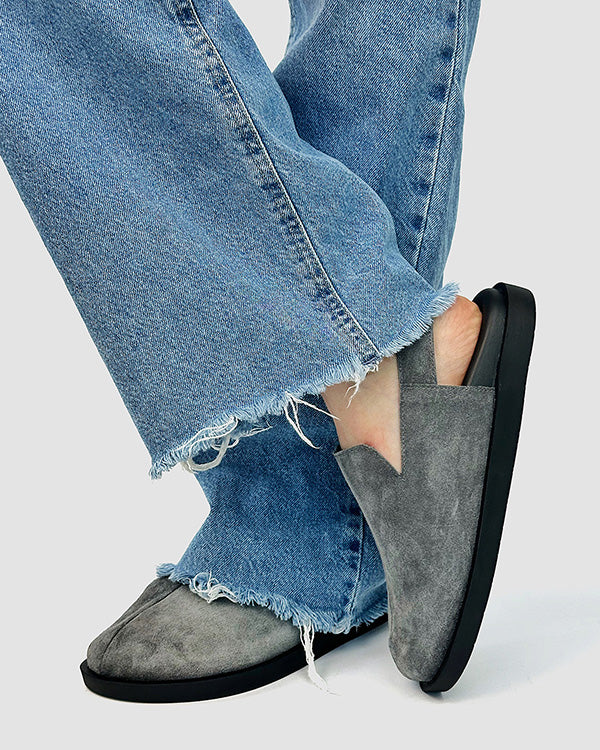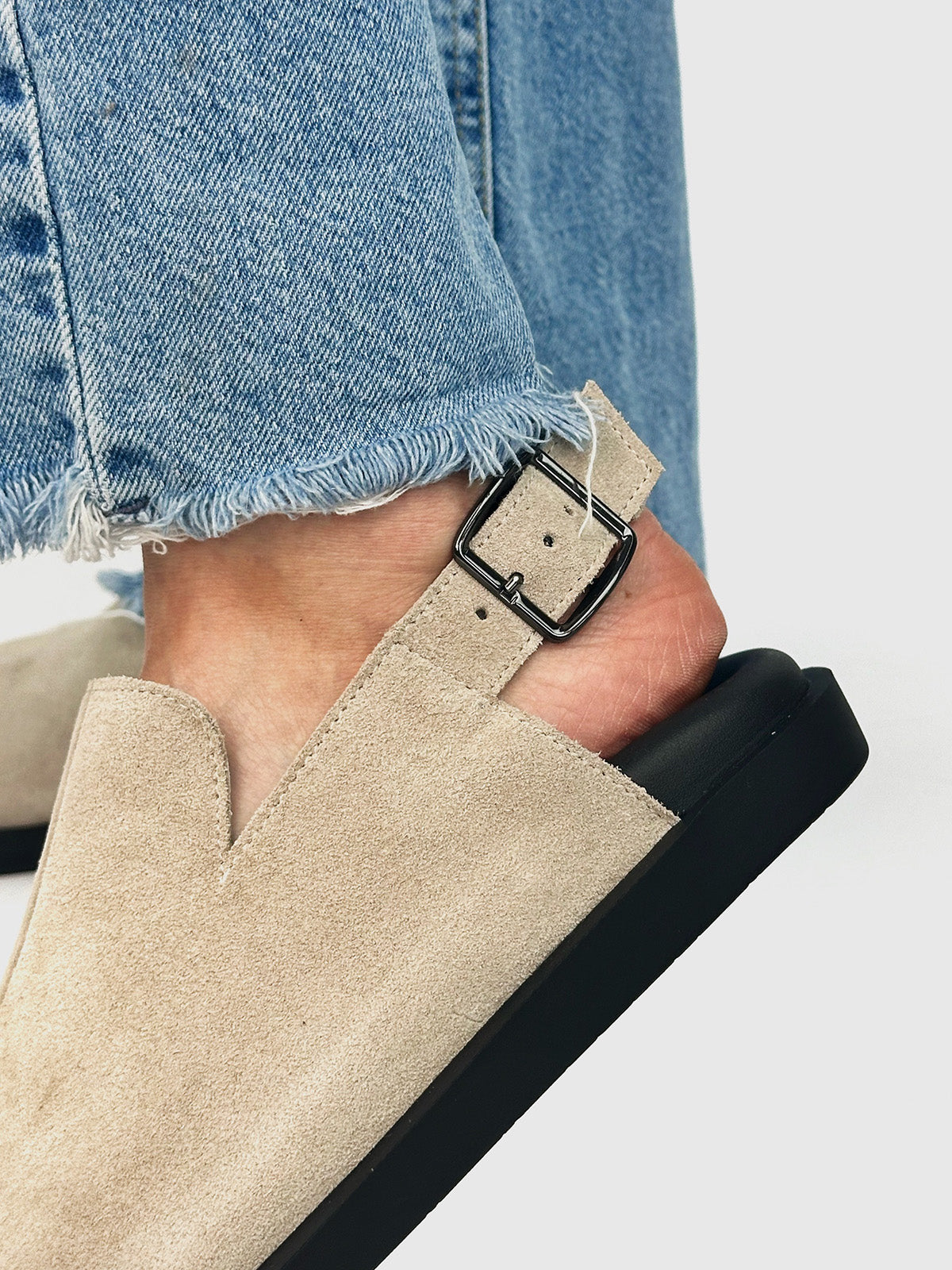 Modne damskie chodaki z zabudowanym noskiem na płaskiej platformie o wysokości 2 cm.